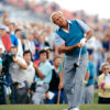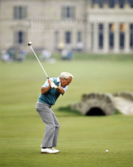 Arnold Palmer teeing off on 18th hole at the 1990 British Open Old Course St. Andrews, Scotland.